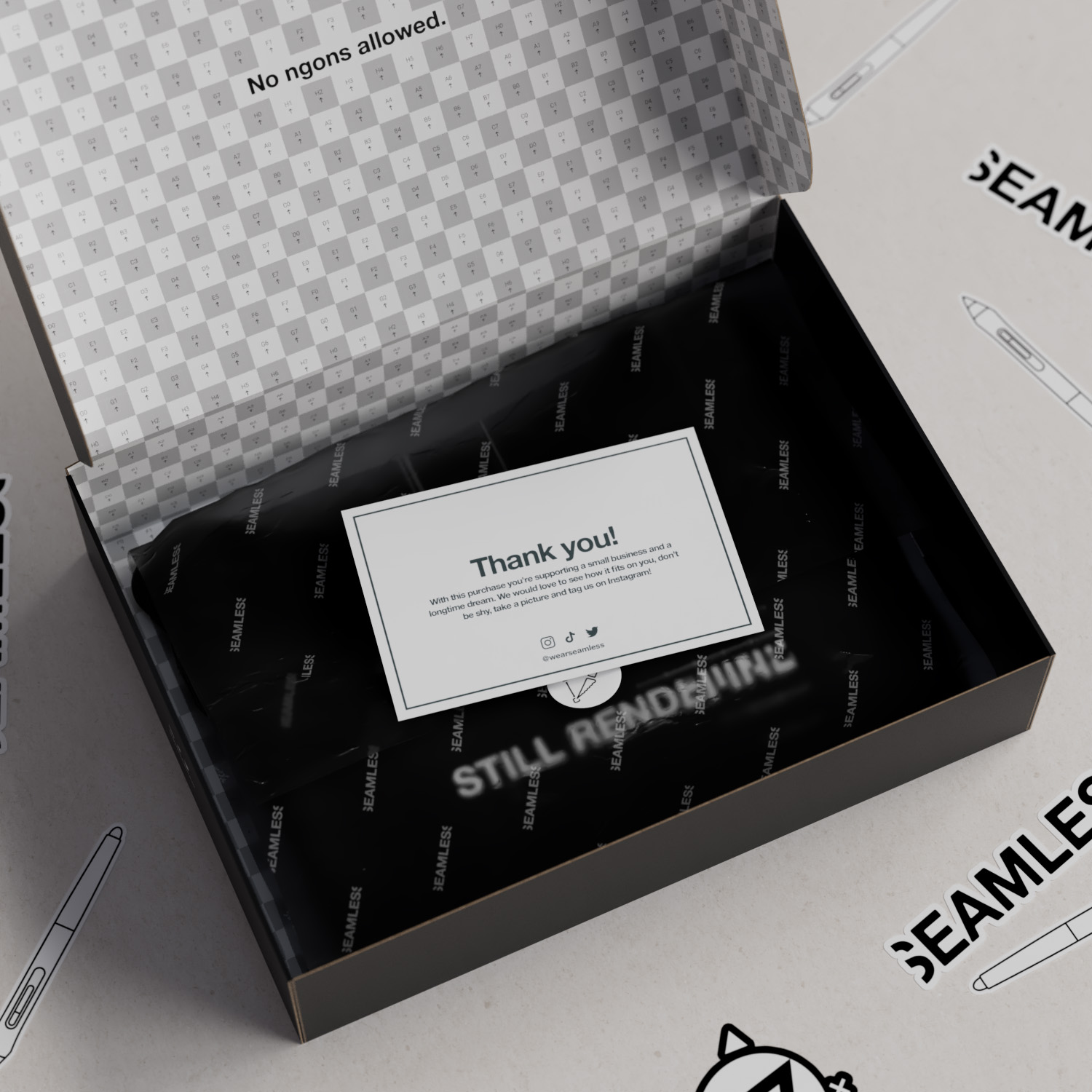 Every order comes in a custom Seamless box, designed to protect the garment and elevate the unboxing experience. I package each piece with care, making sure the first impression feels as premium as the product inside.